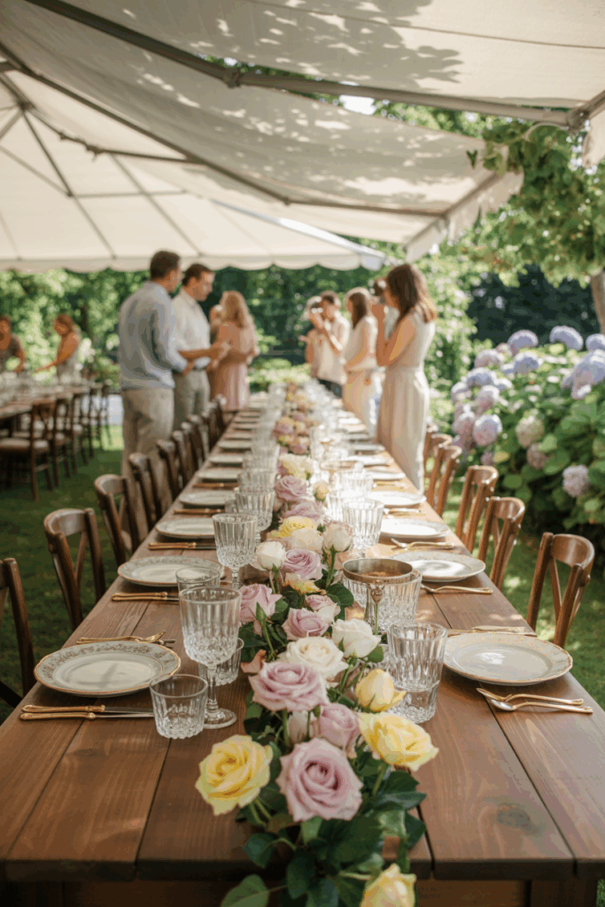 The tables are beautifully dressed with soft tablecloths and floral centerpieces. This adds a touch of elegance while still feeling relaxed. You can easily replicate this look by choosing flowers that match your theme and using simple yet stylish tableware.