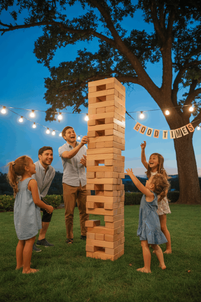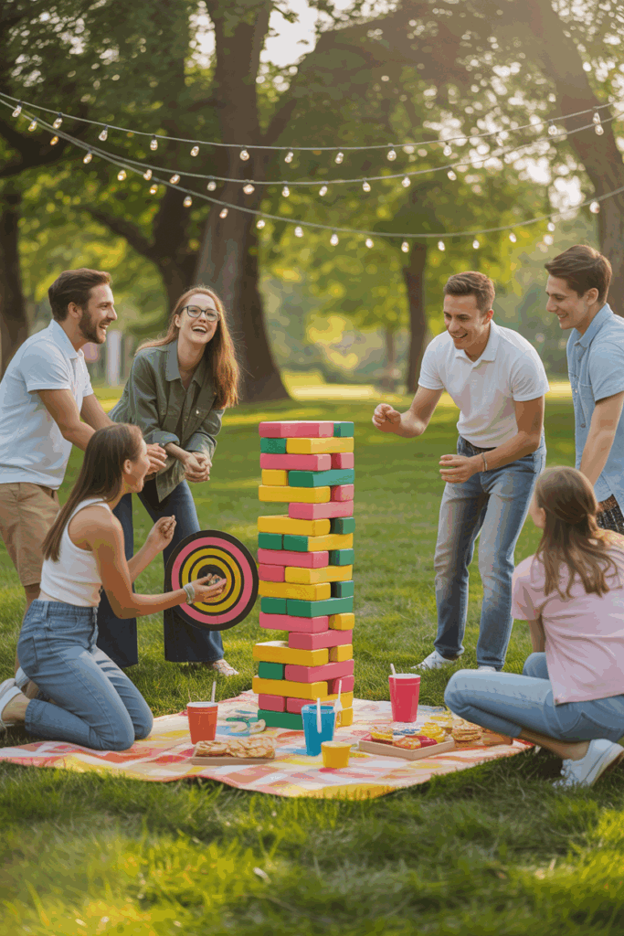 Outdoor parties are a great chance to bring people together, and having fun games can make the day even better. In the image, you can see a lively setup with cornhole boards and a giant Jenga tower. These games are perfect for all ages and can spark friendly competition among guests.