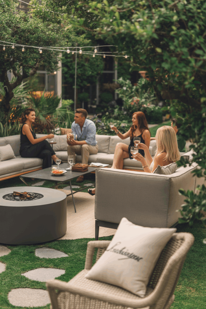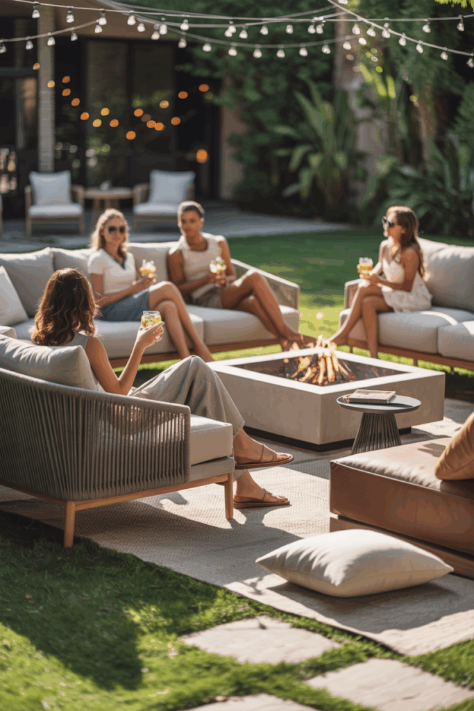 Lighting plays a big role too. The twinkling lights in the image create a warm glow, perfect for evening gatherings. String lights or lanterns can enhance the mood and make your seating area feel special.