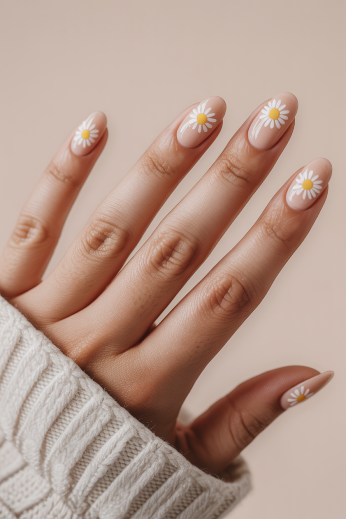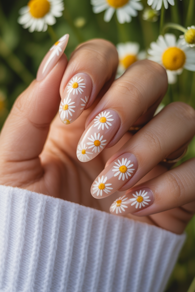 6) Almond-shaped nails featuring delicate daisies