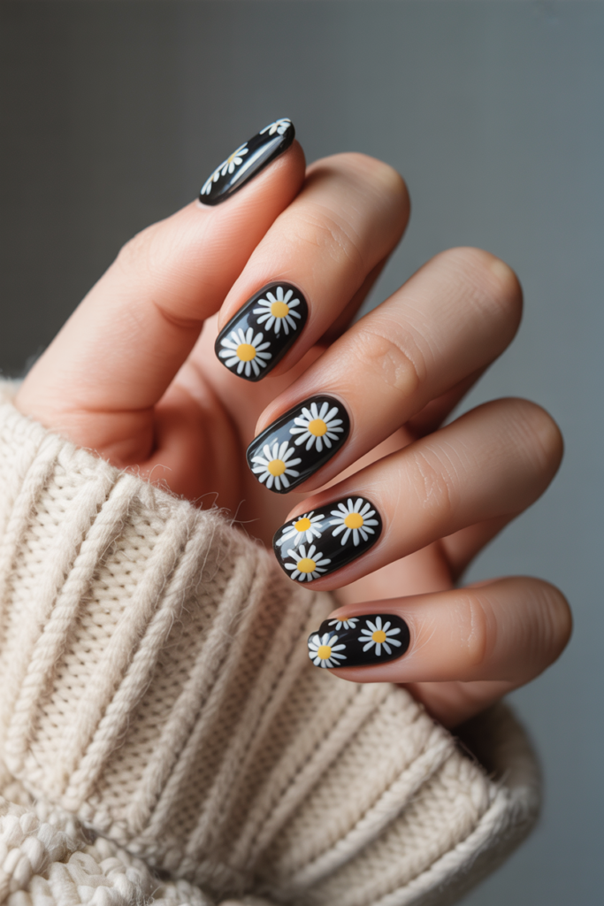 17) Bold black nails with stark white daisies