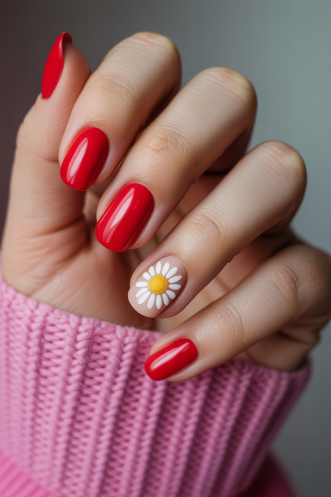 3) Bold red nails with one nude daisy accent