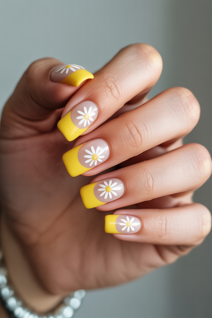 1) Buttery yellow tips with chunky daisy accents