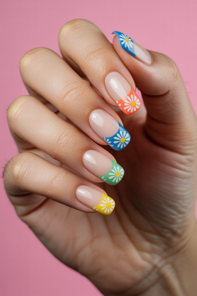 This design pairs simple white nails with bright, colorful daisies at the tips. It adds a fresh and lively touch to a clean look. The colorful daisies stand out against the white base, creating a neat but playful style perfect for spring.