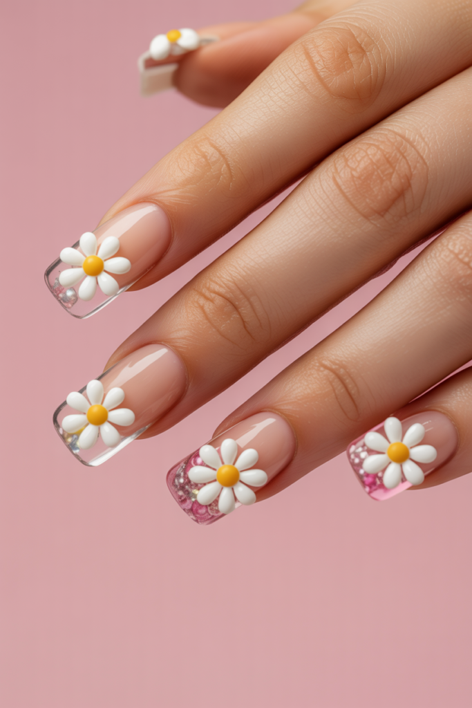 Clear nails create a clean, modern base that highlights 3D daisy designs. The raised flowers add texture and depth, making the nails stand out without being too bold. This style suits those who want a subtle yet interesting spring look.