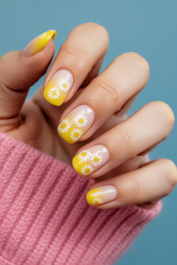 This design blends soft colors that fade smoothly from one shade to another. The gradient background sets a calm, elegant tone. Small clusters of daisies appear near the tips or sides, adding a natural and delicate detail. It works well for a fresh spring look.