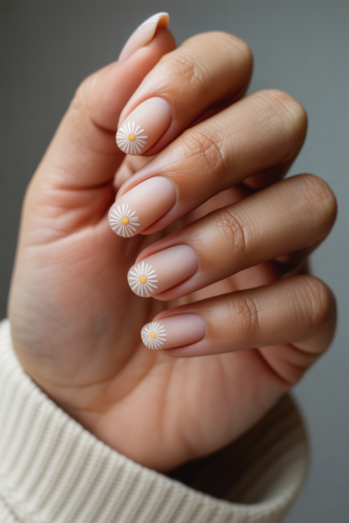9) Matte nude nails with minimal daisy outlines