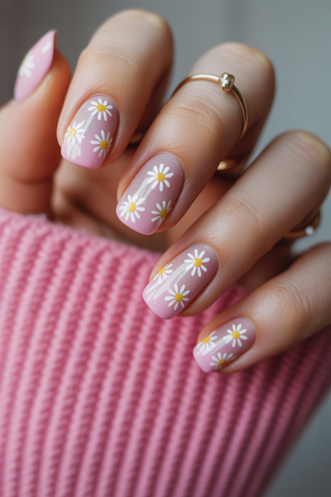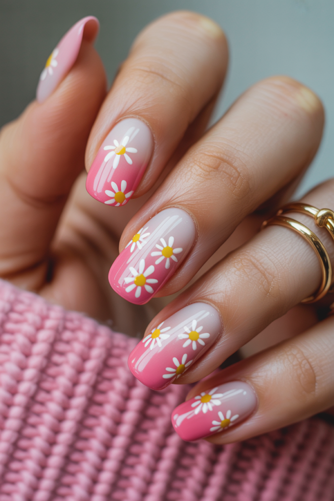 Ombre pink nails blend soft shades from light to darker pink. Small daisies add a delicate floral detail that enhances the look without overwhelming it. This design suits spring and brings a fresh, clean style to any manicure.