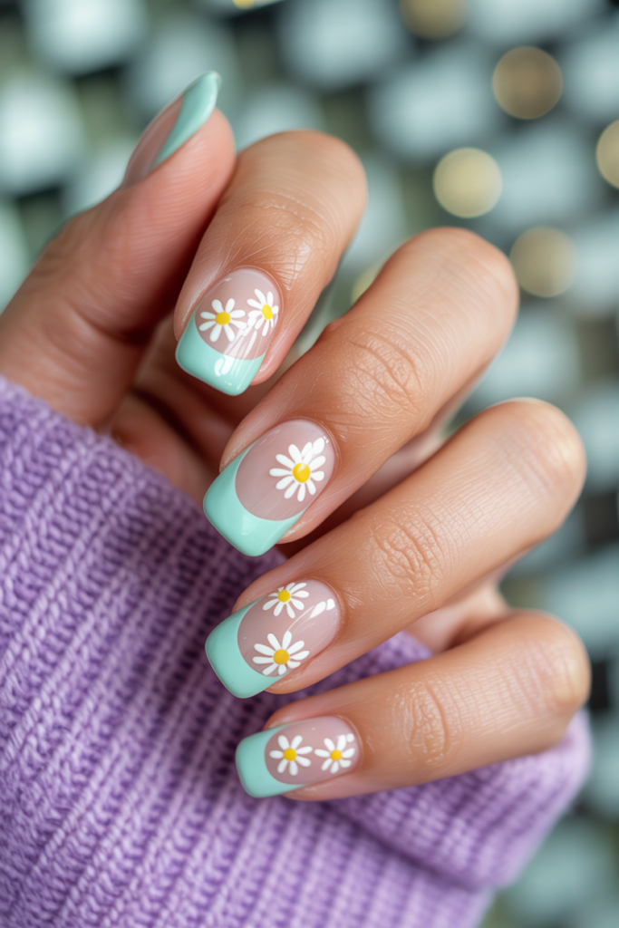 This style pairs soft pastel tips with small, delicate daisy designs. The pastel colors keep the look light and fresh.