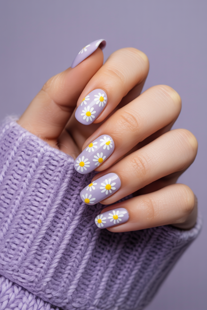 This design features a gentle lavender base that creates a calm and fresh look. Small daisies are scattered across the nails, adding a delicate flower detail without overpowering the soft color. It suits spring well and works on various nail shapes.