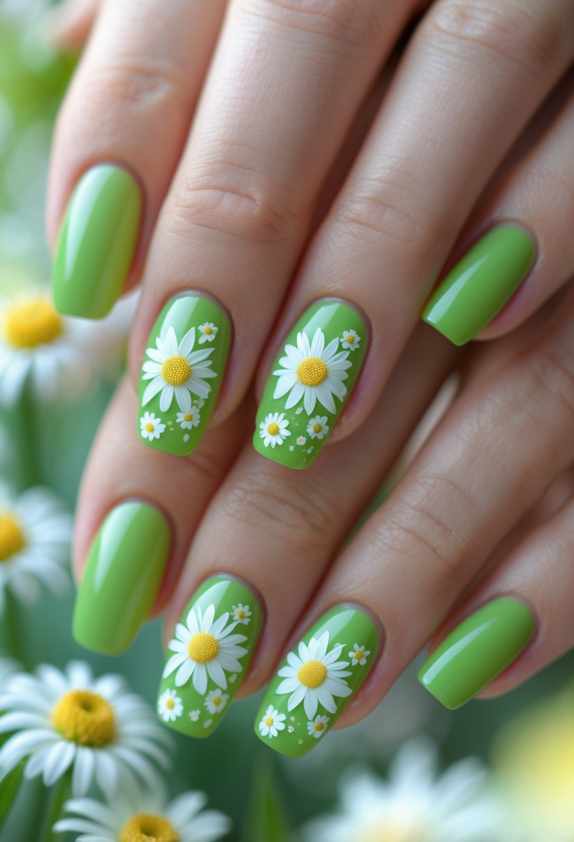 Bright green nails create a fresh and lively base for white daisy designs. The contrast makes the flowers stand out clearly.