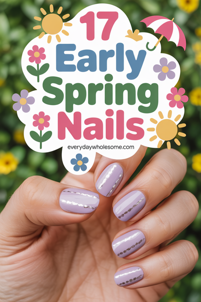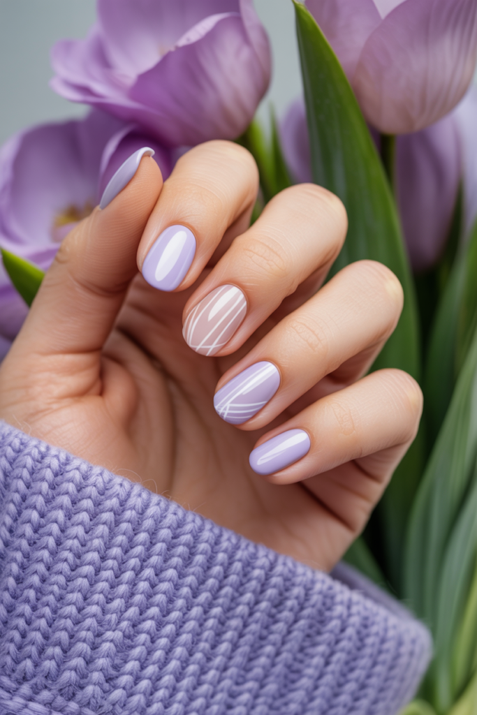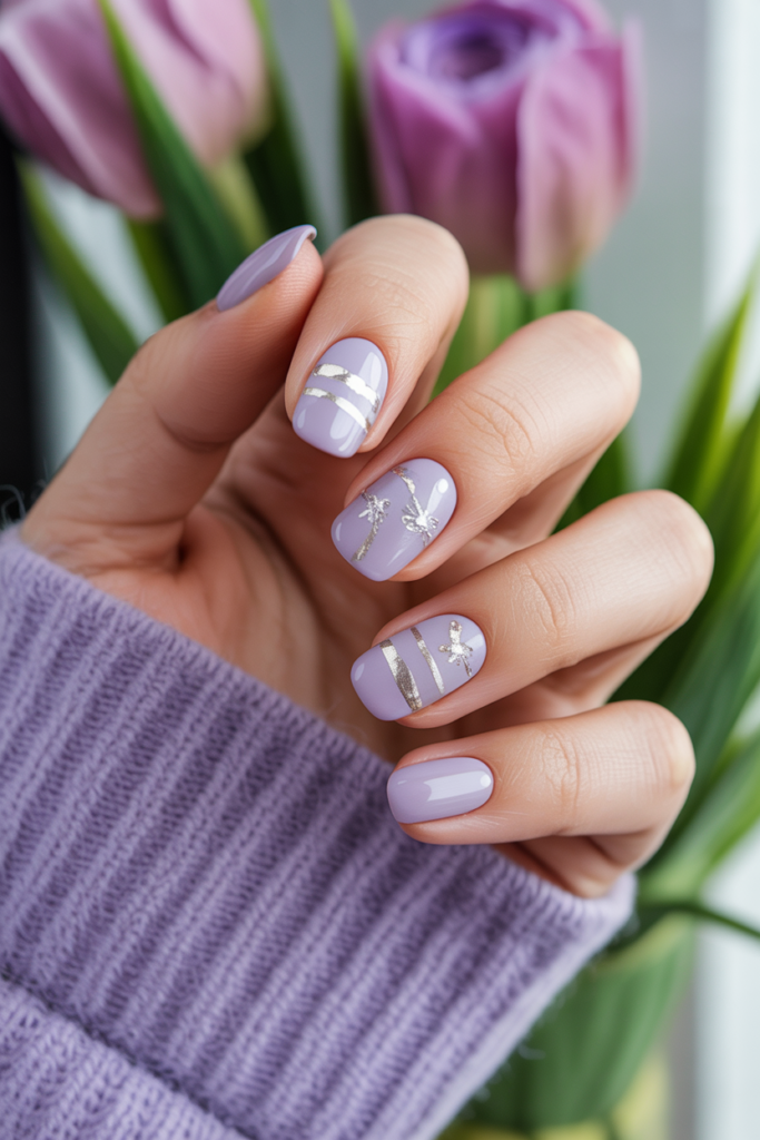 Soft lilac nails create a gentle and fresh look. The silver accents add a touch of shine without overpowering the soft color. This combination works well for early spring when colors are light but still show style.