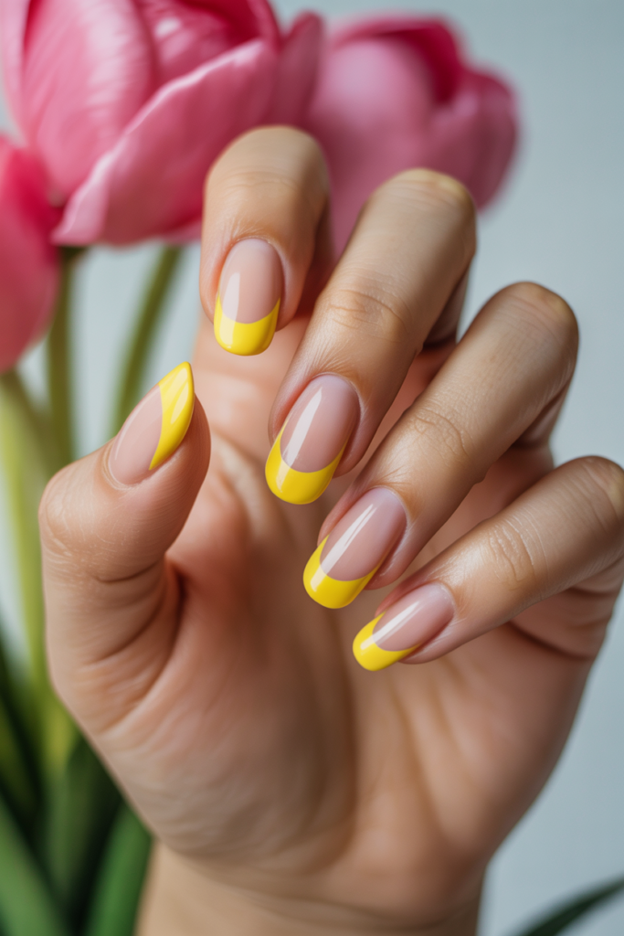 Bold yellow French tips offer a fresh update to the classic look. They pair well with soft pink or nude bases, creating a sharp contrast. This style suits various nail shapes, from square to almond, and adds a bright, cheerful touch ideal for early spring.