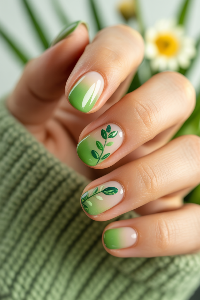 This design uses smooth green shades that blend from light to dark. It creates a natural, soft gradient effect on the nails. Small leaf patterns add a subtle, nature-inspired touch that feels fresh and simple. The look works well for early spring and suits different nail lengths.