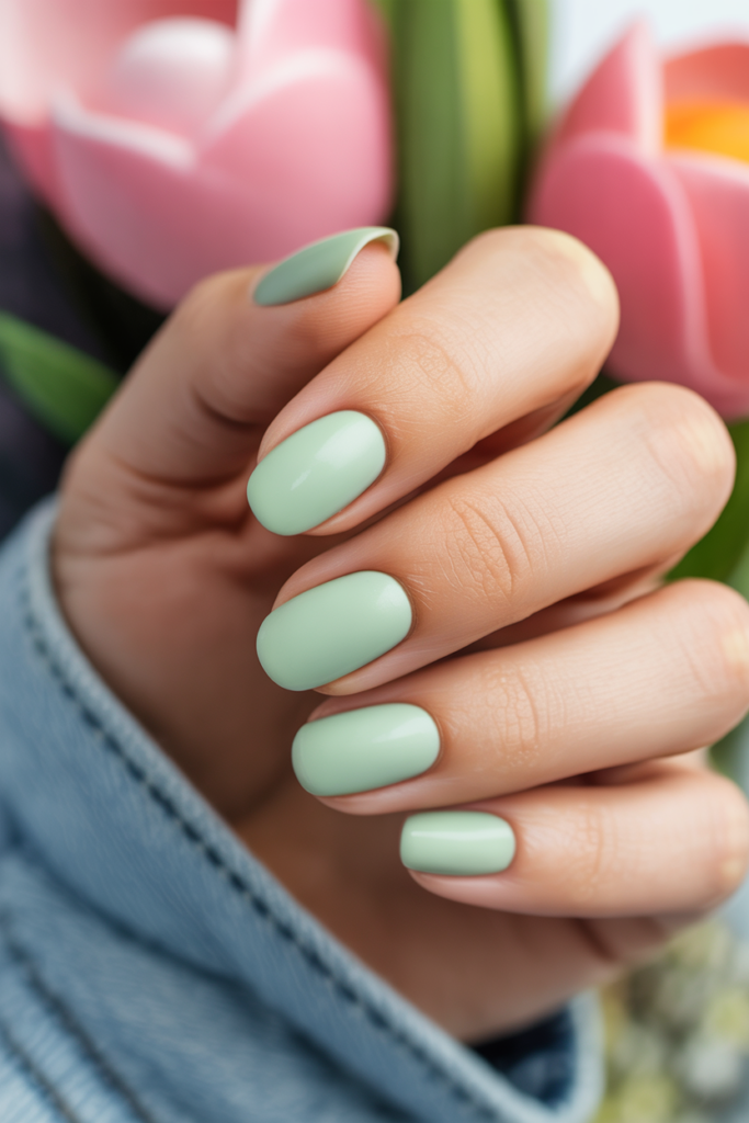 Mint green matte nails offer a soft, modern look perfect for early spring. The matte finish adds a smooth, understated texture that makes the color stand out without shine. This style works well on its own or with simple white or floral accents for a subtle, fresh feel.