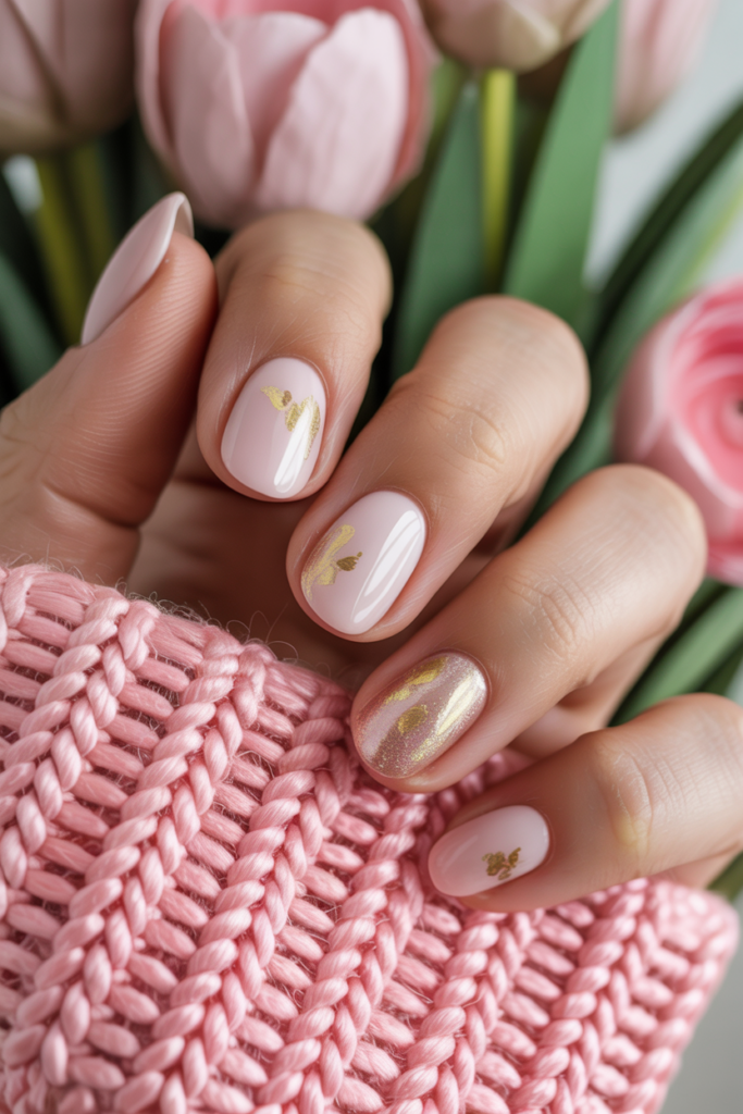 This nail design uses a soft baby pink base with a shiny, glossy finish. Gold foil accents add a touch of elegance without being too flashy. The look is simple but stylish, suitable for early spring and many occasions.