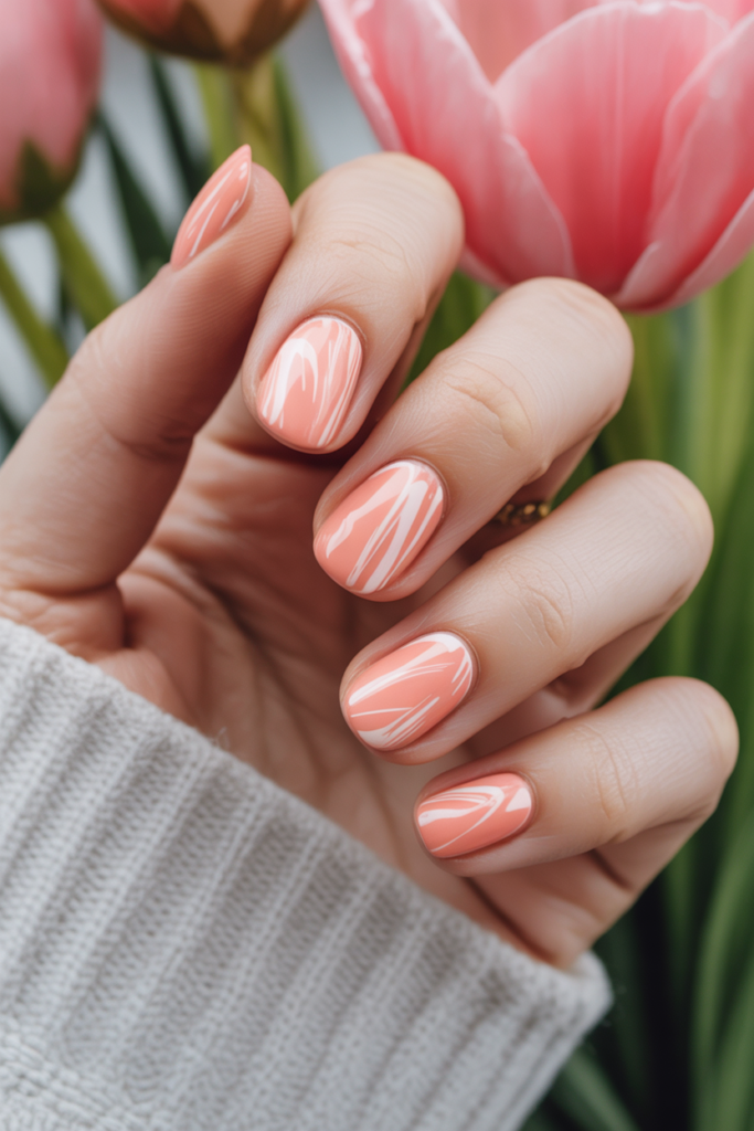 This look pairs a soft coral base with simple, abstract brush strokes. The strokes add a modern, artistic touch without overwhelming the nails.