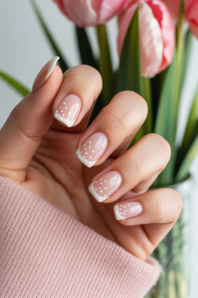 This nail design keeps it simple with a nude base and tiny white dots on the tips. The look is clean and subtle, perfect for those who prefer understated nail art. It adds a small touch of detail without being too bold.