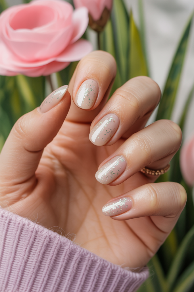 Neutral beige nails offer a clean and timeless look. Adding a touch of subtle glitter gives a soft sparkle without being too flashy.
