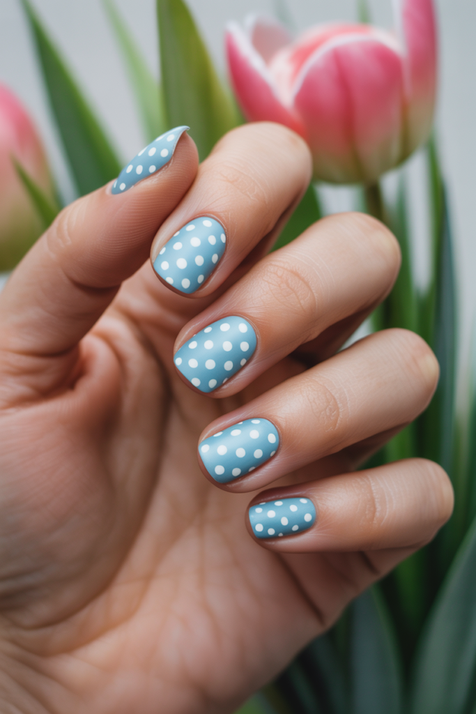 This design pairs soft pale blue nails with white polka dots for a fresh, simple look. The matte finish adds a modern touch and makes the colors stand out without shine. It works well for early spring, bringing a gentle and clean style to the nails.