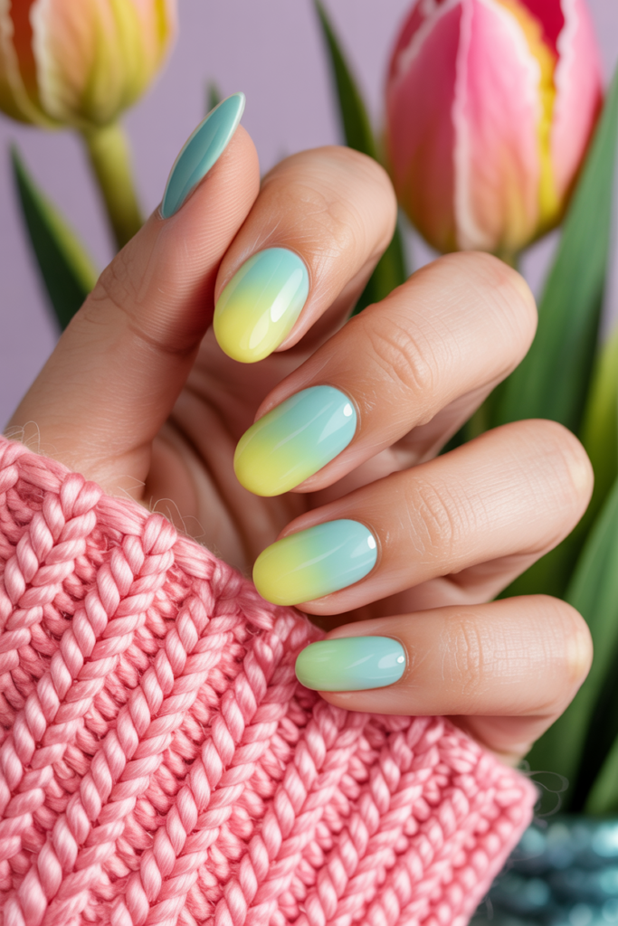 This look blends soft pastel colors smoothly across the nails. The glossy finish adds a sleek shine that makes the colors stand out.