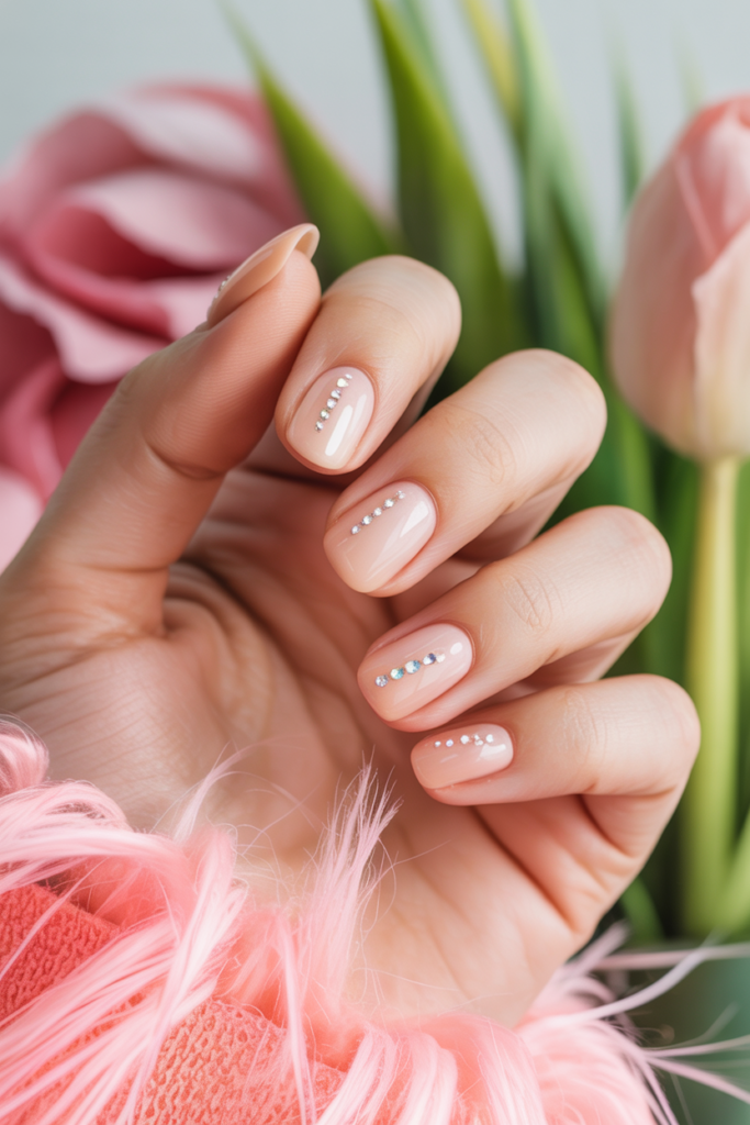 Sheer peach nails create a soft, elegant look perfect for early spring. Adding tiny rhinestones gives a subtle sparkle without being too bold. This combination works well for both casual days and special occasions, offering a fresh and polished style.