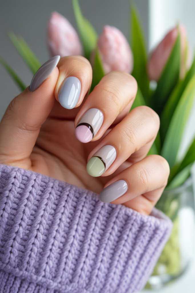The style works well on almond-shaped nails, giving a longer and more elegant appearance. It suits early spring with its fresh and subtle tones.