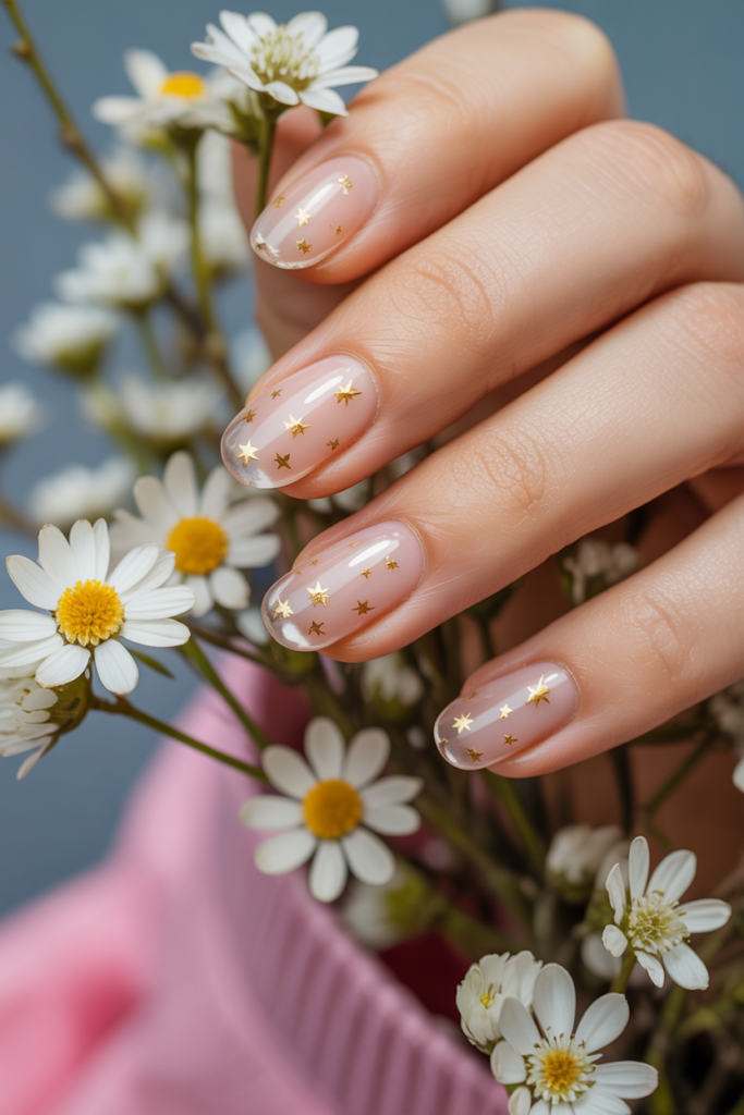This design uses a clear or lightly tinted base for a fresh, light look. Tiny gold stars are placed sparingly to add subtle shine without overpowering the nails. It works well for those who want a soft, elegant spring manicure with a touch of sparkle.