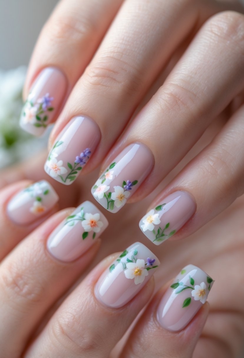 Delicate floral designs work well on a clear base, creating a soft and subtle look. The see-through background lets the flowers stand out without looking heavy. This style suits people who want elegant nails that feel light and natural.