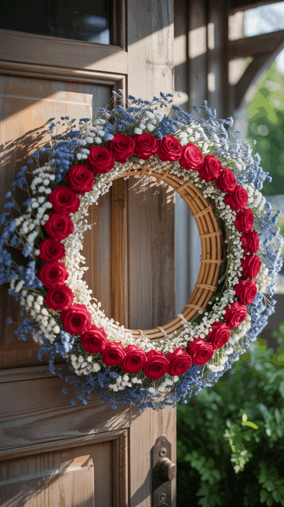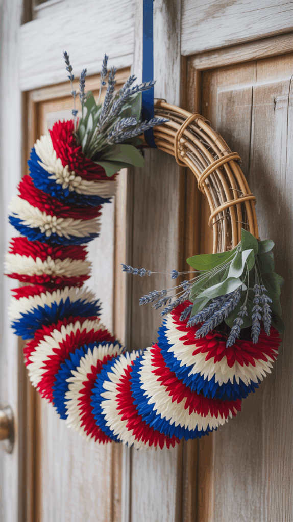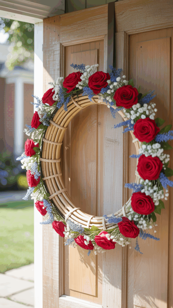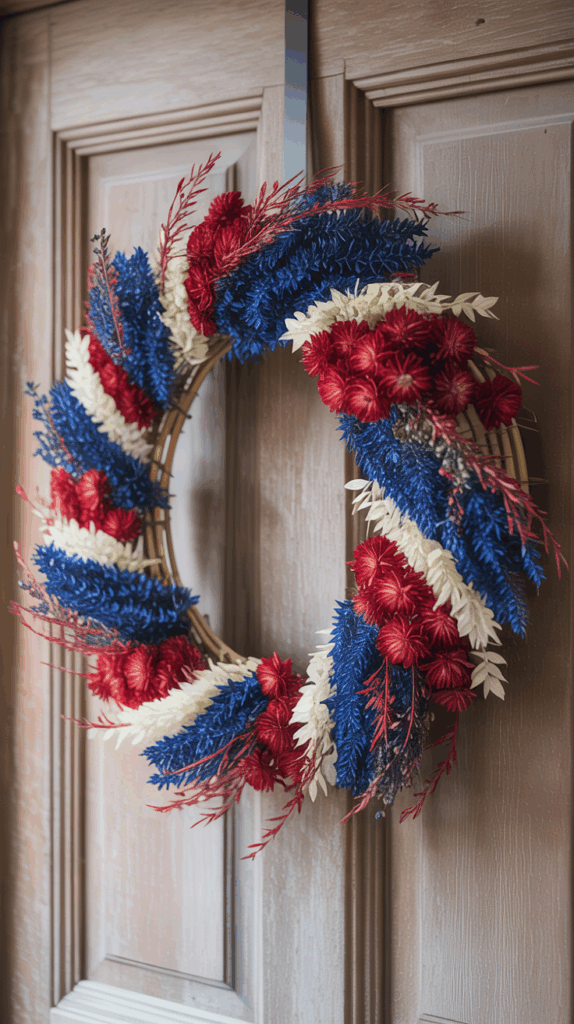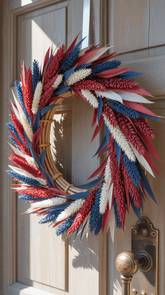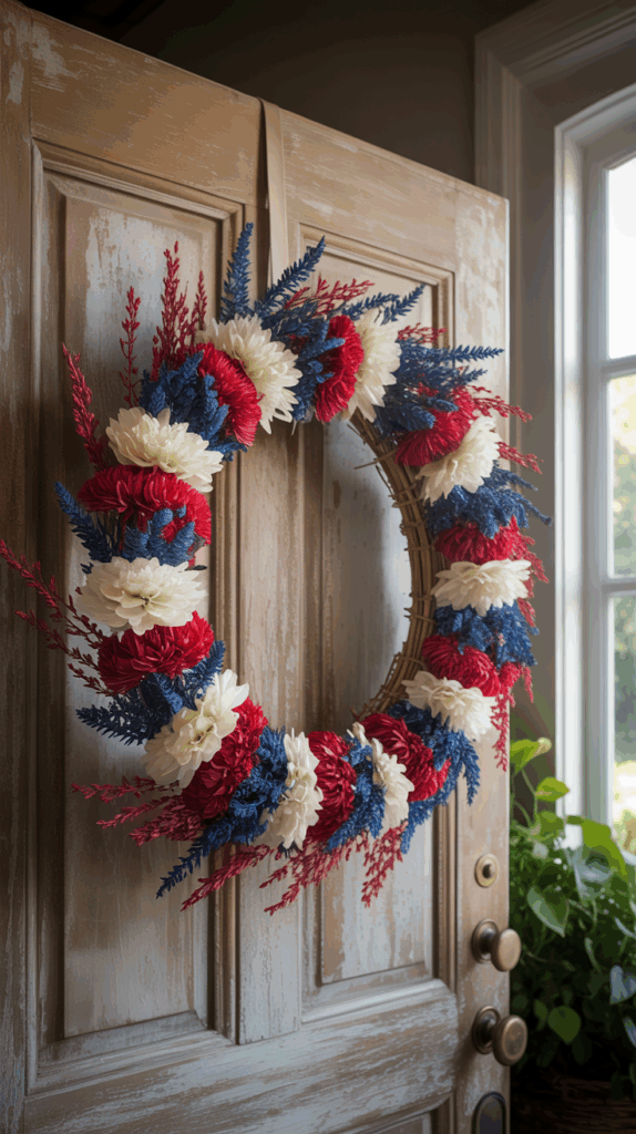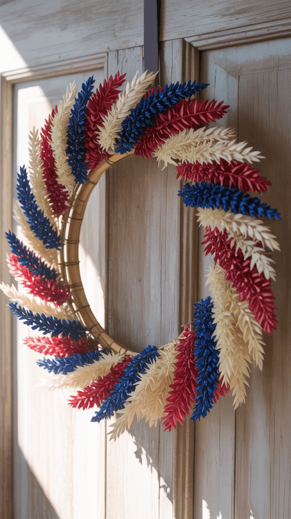 Paint wooden stars in alternating red, white, and blue and attach them to a metal hoop. Add twine or a bold ribbon for hanging. This one’s especially cute for modern farmhouse or minimal front porch styles.