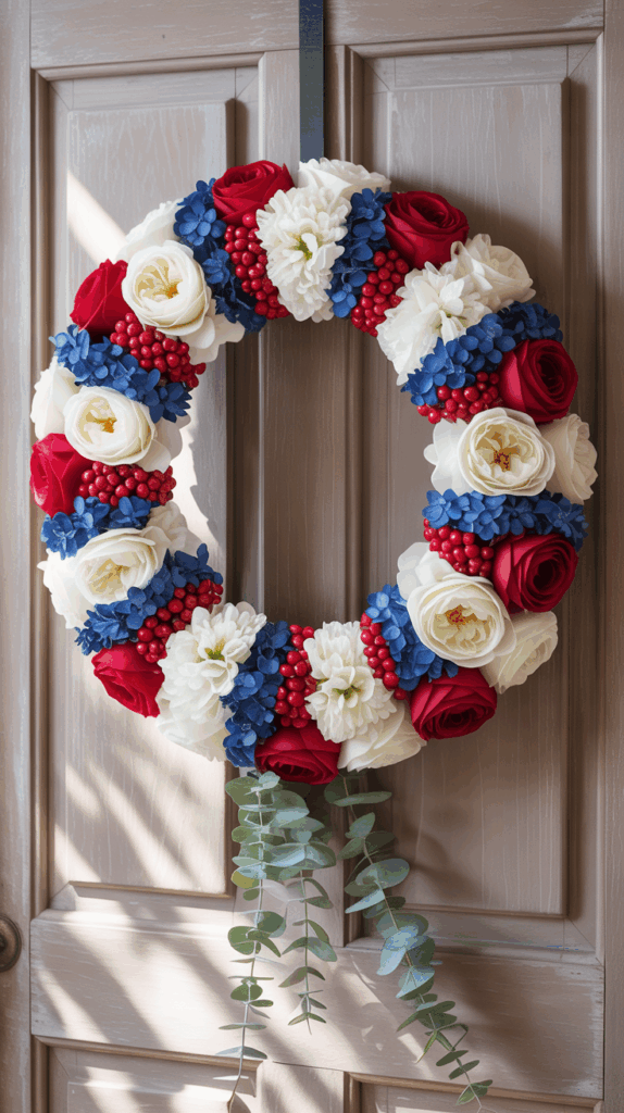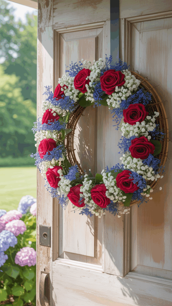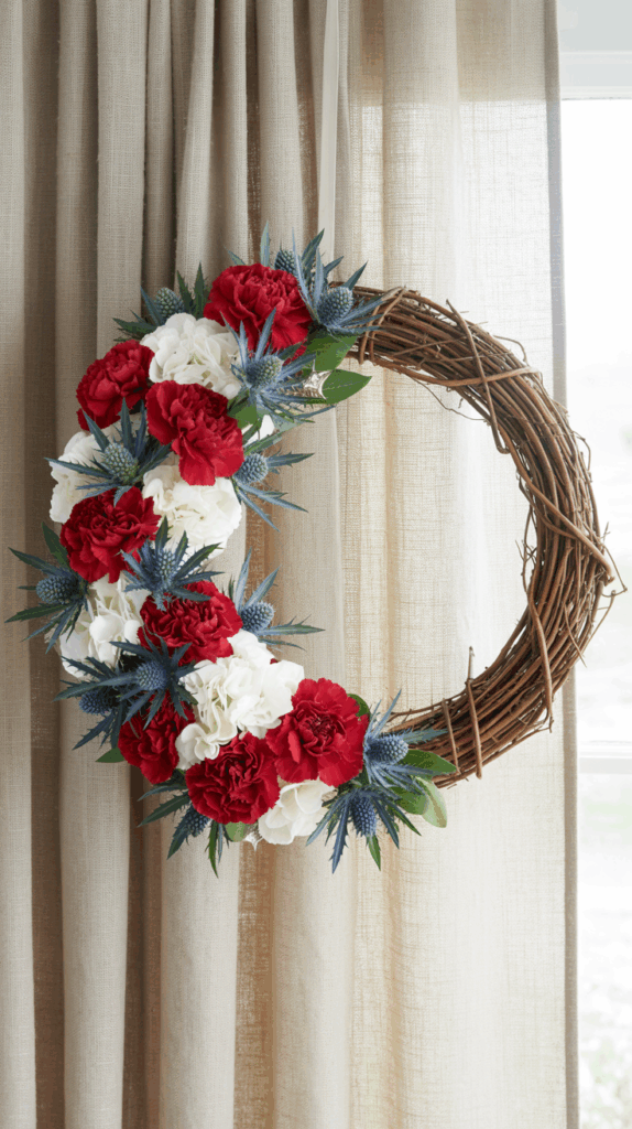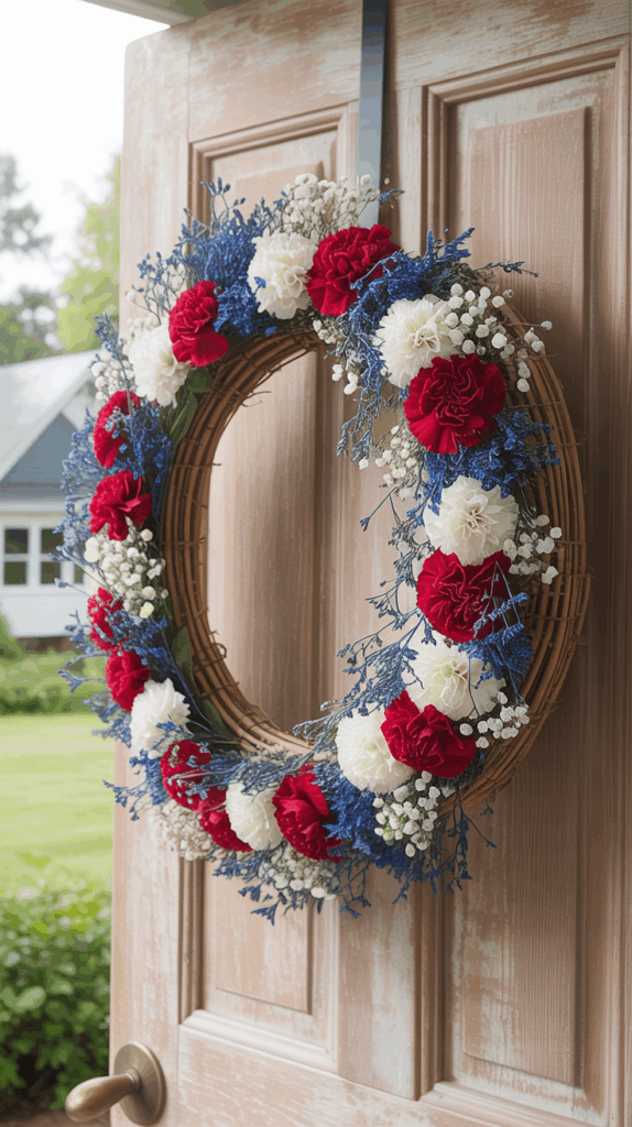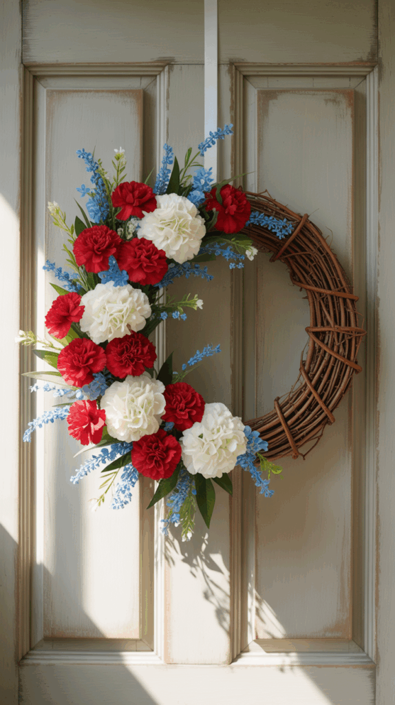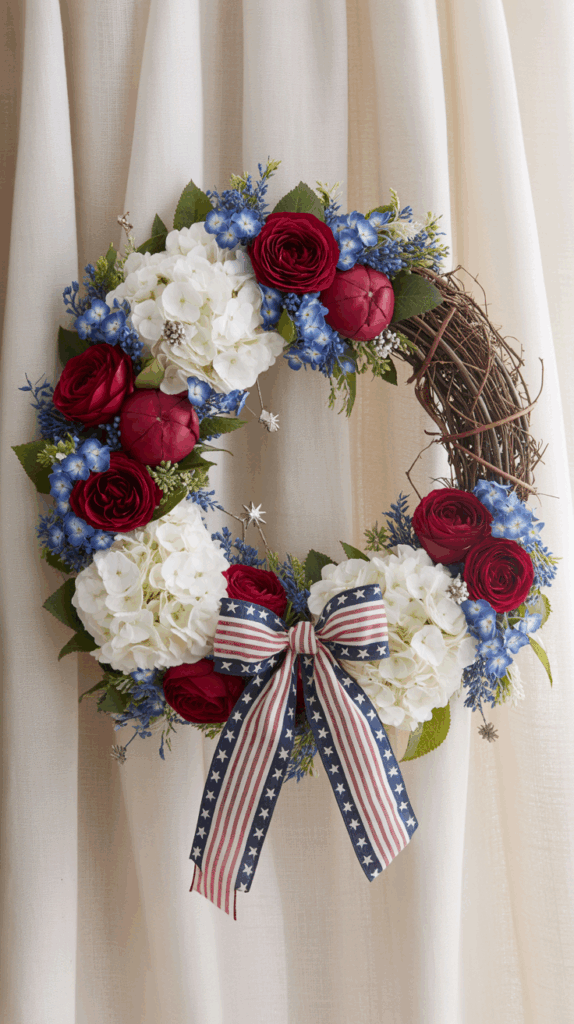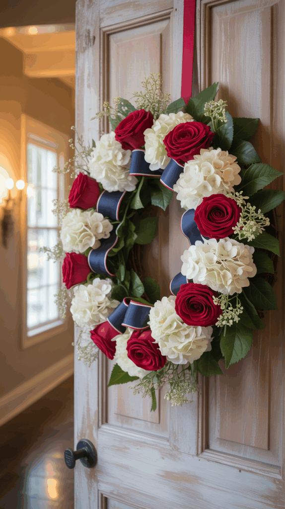 Use distressed wood or a grapevine base, add white peonies and dusty blue accents, and tie in a red striped bow for subtle patriotic elegance.