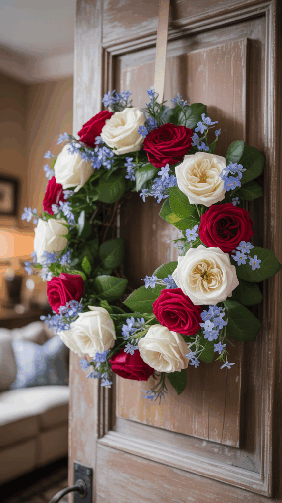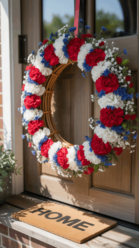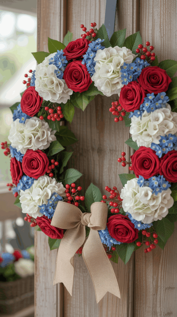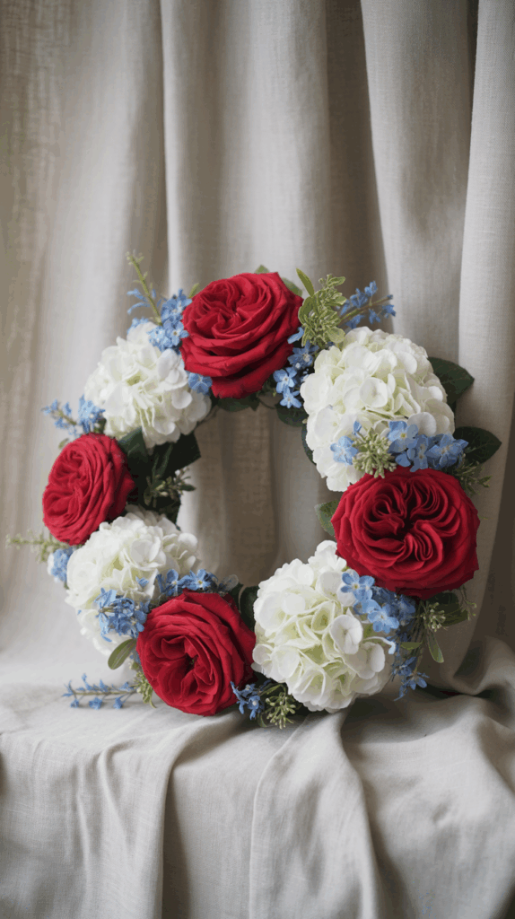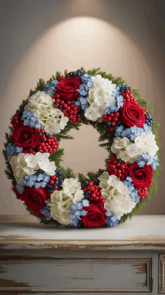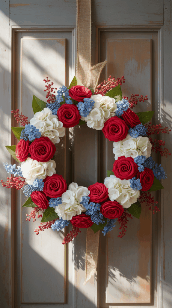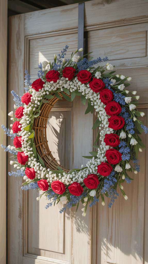 Use distressed wood or a grapevine base, add white peonies and dusty blue accents, and tie in a red striped bow for subtle patriotic elegance.