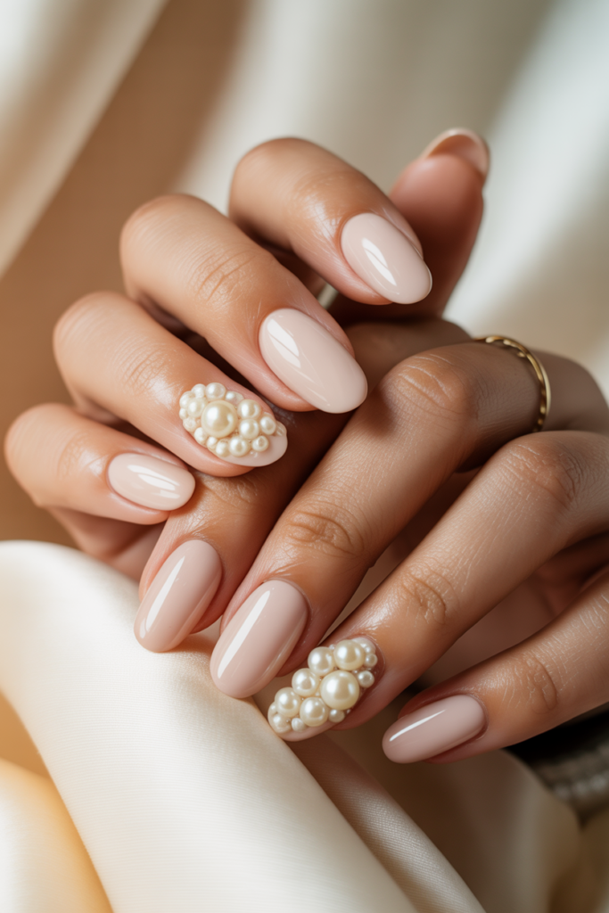 Classic nude nails offer a clean, timeless base. Adding pearl accents gives them a subtle luxury without being overdone.