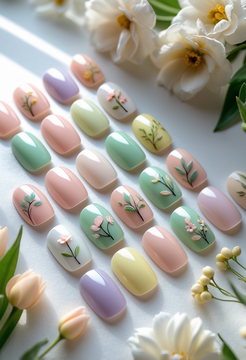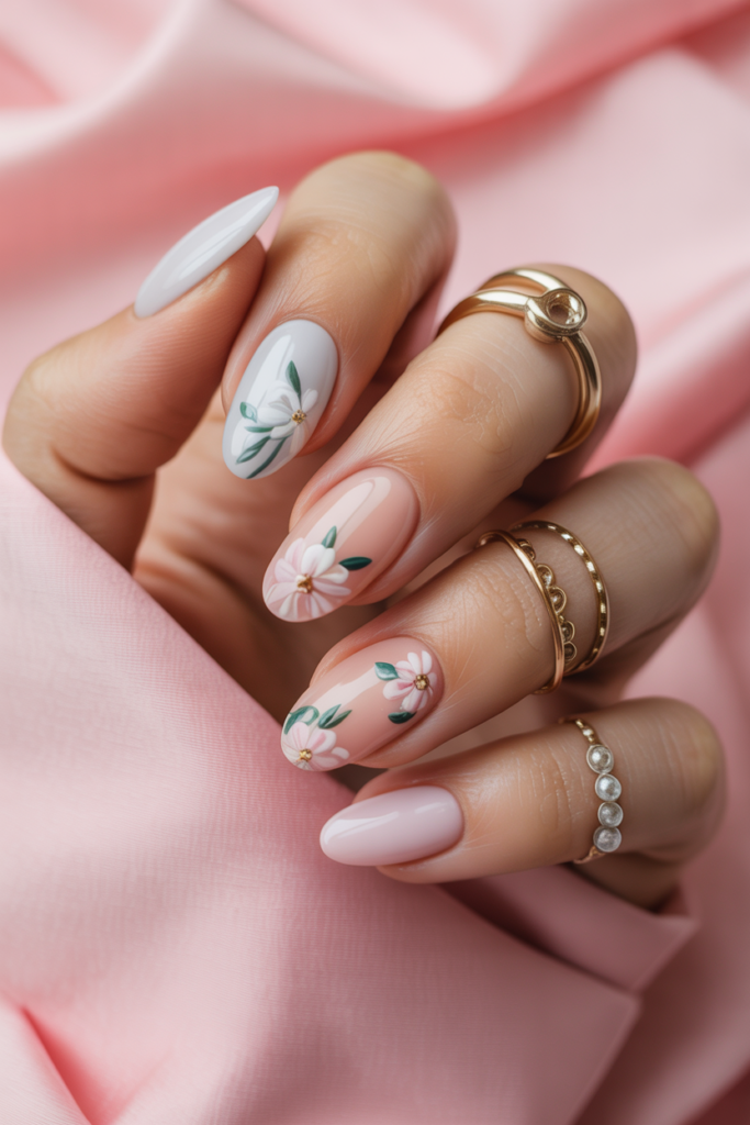 Small floral designs on a few nails provide a delicate and fresh detail. This style suits both casual and formal settings.
