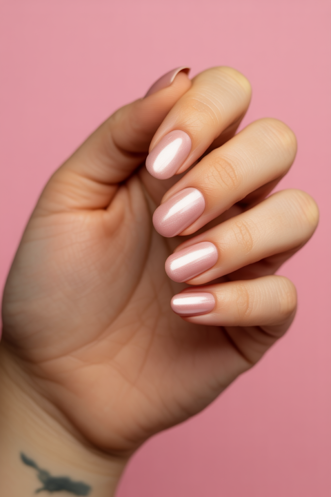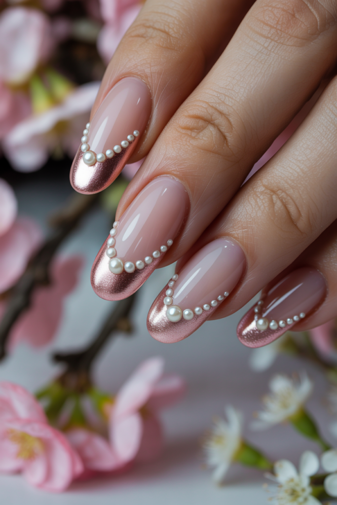 This style blends soft blush pink with pearl and chrome accents. The pearl adds a smooth, shiny texture that contrasts well with the reflective chrome finish. It creates a balanced look that feels both elegant and modern. This mix suits many occasions in spring.