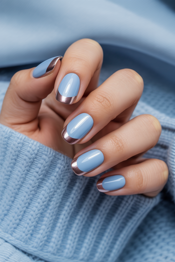 This design pairs soft baby blue polish with shiny metallic tips. The contrast creates a modern, elegant look.