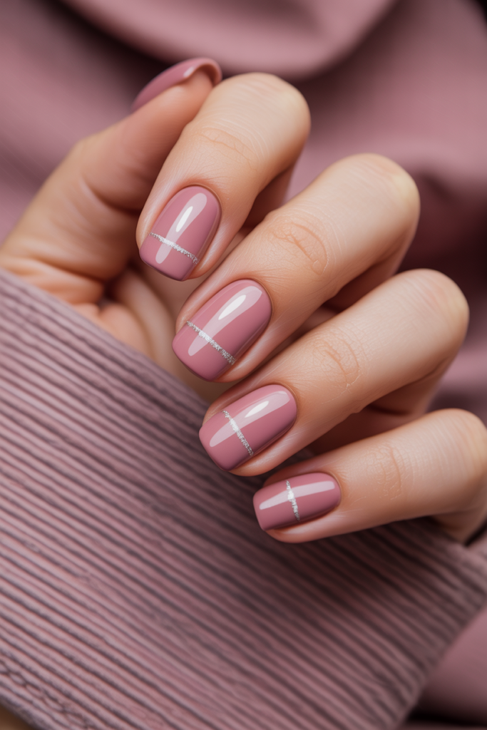 Dusty rose nails paired with thin silver lines create a refined and modern look. The soft pink shade keeps the design subtle, while the silver lines add a sleek, stylish touch.