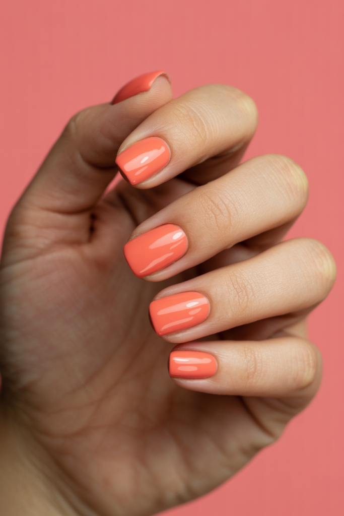Light coral nails offer a soft and fresh look perfect for spring. The glossy top coat adds shine and makes the color last longer. This simple style works well for both casual and formal occasions.