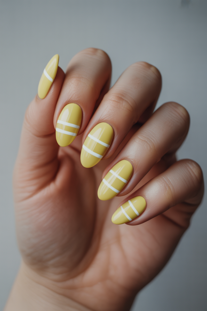 Light yellow almond nails offer a fresh and soft look for spring. The almond shape adds elegance and length without being too bold. Minimalist stripes provide a subtle contrast, keeping the design clean and modern. This style works well for both casual and formal settings.