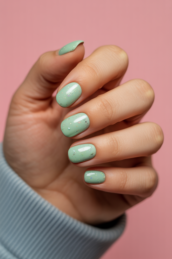 This style features short nails painted in soft mint green. A delicate sparkle adds a gentle shine without overpowering the look. It suits those who want a fresh, elegant manicure that works for both everyday wear and special occasions.