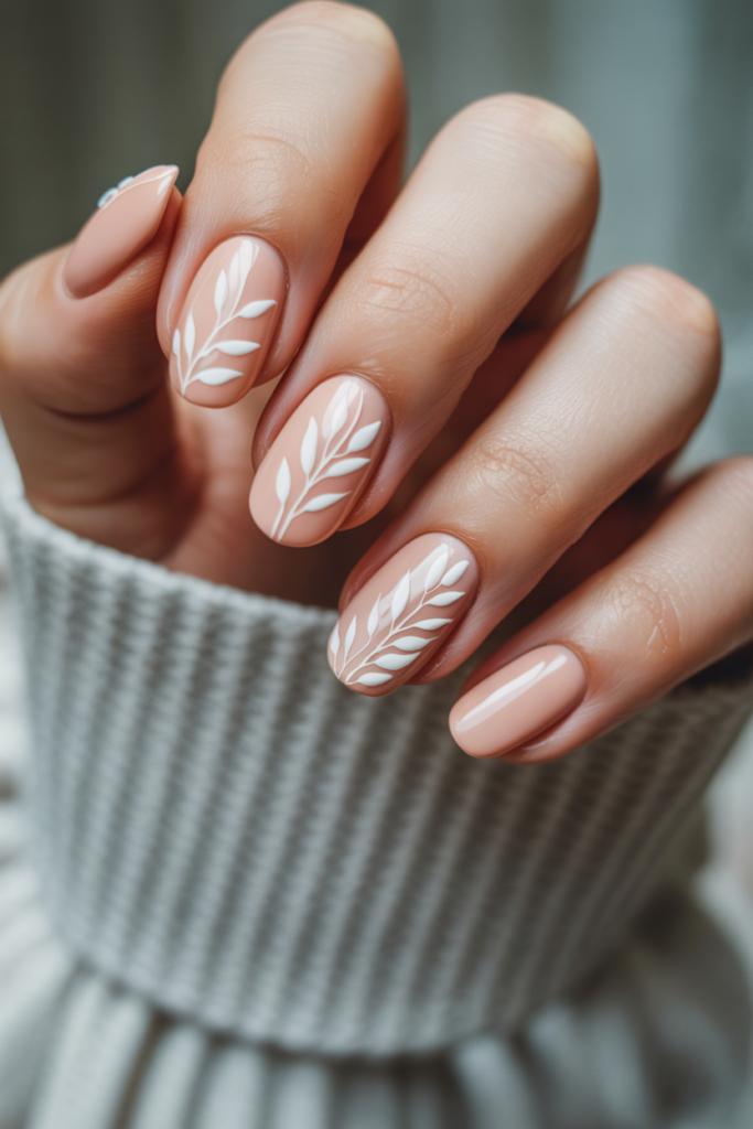 This design pairs soft pale peach polish with thin, detailed leaf patterns. The leaves add a natural, gentle touch without overwhelming the look. It suits those who want a subtle yet elegant style for spring. The light color keeps the nails fresh and clean.