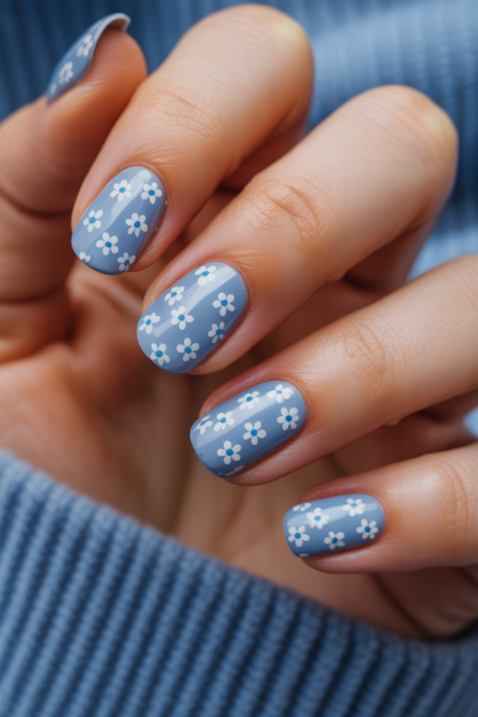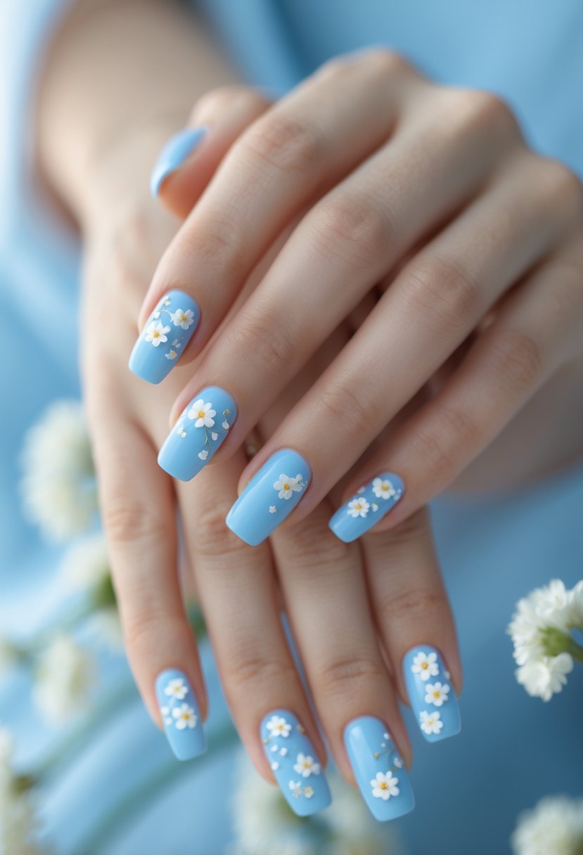This design pairs a soft blue base with small white floral details. The delicate flowers add a subtle, fresh touch to the nails. It suits those who want a gentle, elegant look without bold colors. The style feels light and perfect for spring.