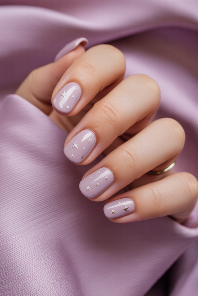 Soft mauve nails create a calm and stylish base. Adding tiny star decals gives a subtle sparkle without being too flashy.