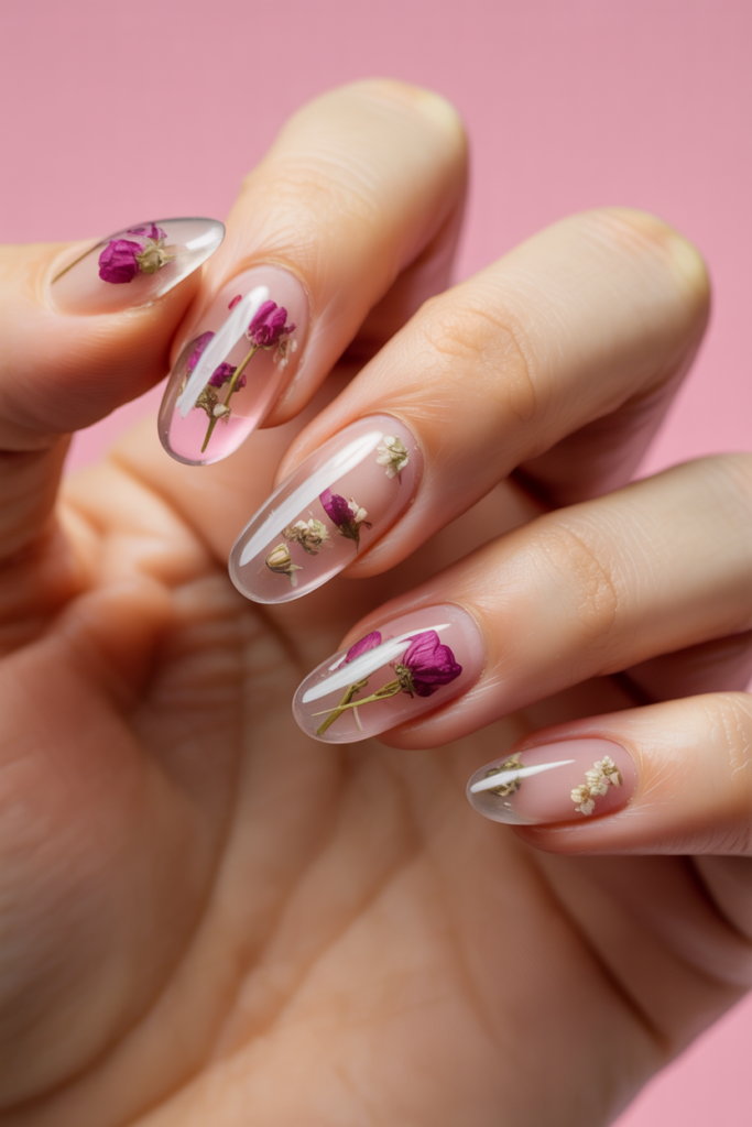 This style uses clear layers to hold real dried flowers inside the nail. It creates a natural, delicate look that feels fresh and unique. The flowers add subtle color without overpowering the design. It works well for those who want an elegant yet simple spring manicure.