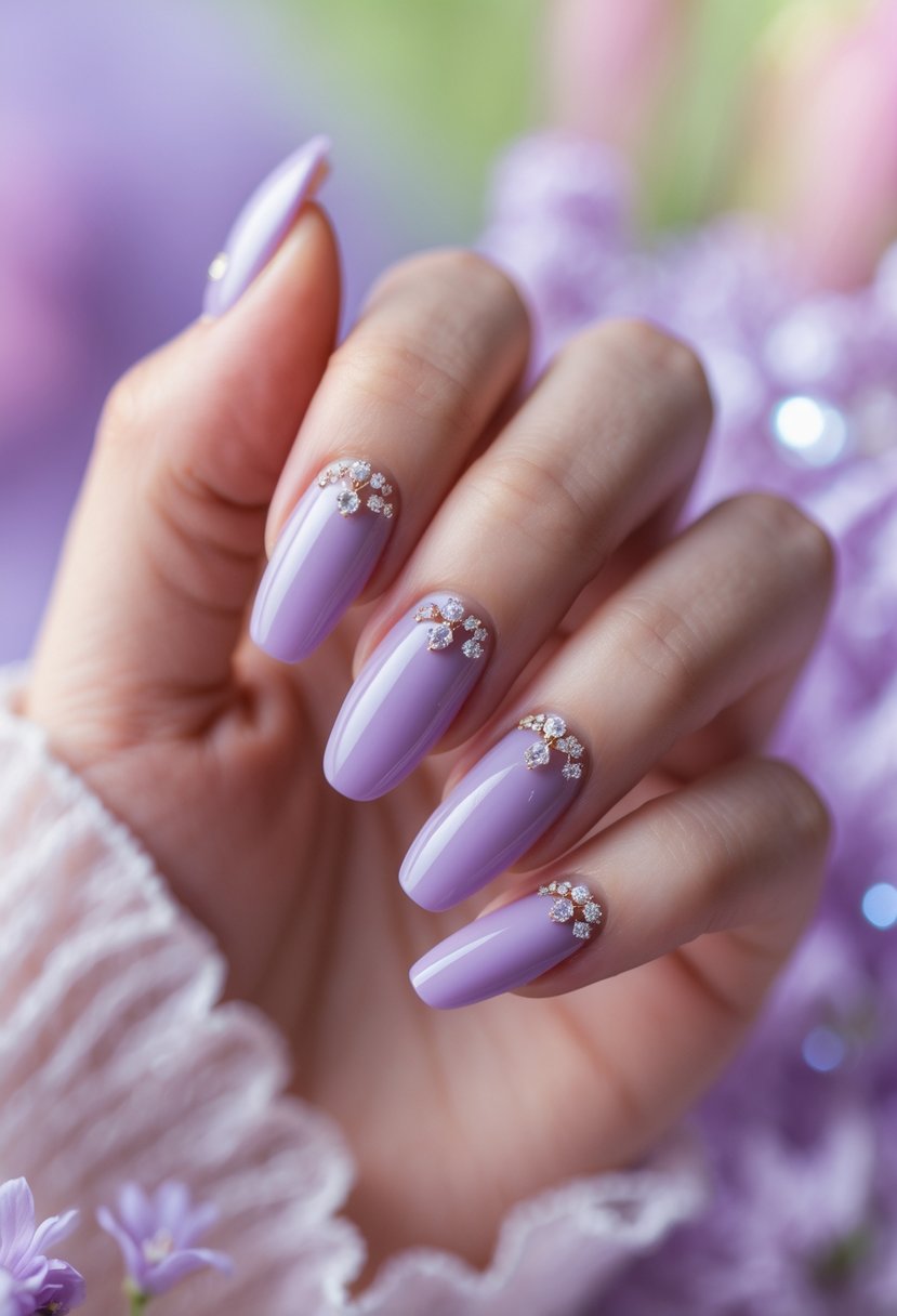 Lilac nails with tiny rhinestones create a simple yet polished look. The soft purple base adds a gentle touch, while the rhinestones bring subtle sparkle.