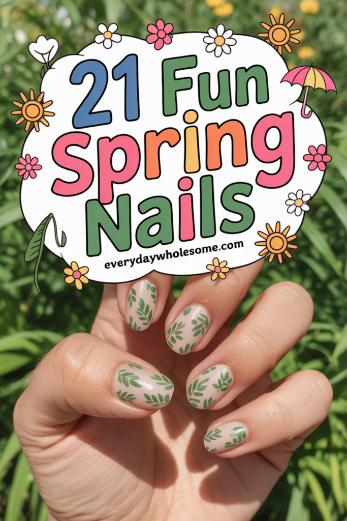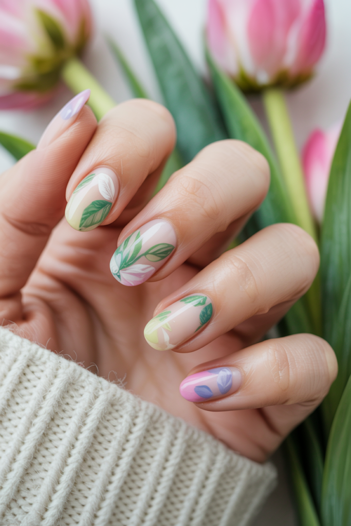 Green leaf patterns add a natural and fresh look to spring nails. They often use delicate lines to mimic the shape of leaves. This design works well on any nail length and pairs nicely with soft or bold green shades.