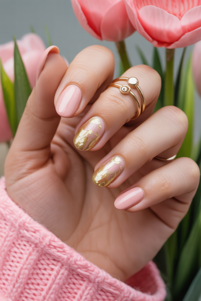 Blush pink nails offer a soft, delicate base that fits any style. Adding gold foil accents gives a touch of texture and shine without being too bold. This mix works well for both casual days and more formal events. It balances elegance and subtle glamour.