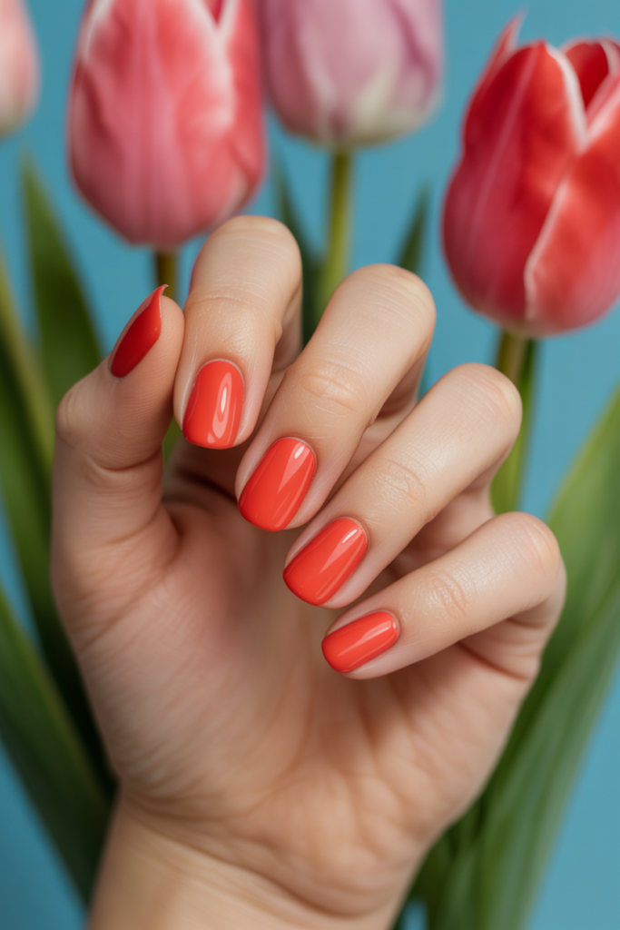 Bright Tulip Red nails bring a fresh, lively touch to spring. The color is bold but natural, fitting well with floral themes. It suits many nail shapes, from oval to square.