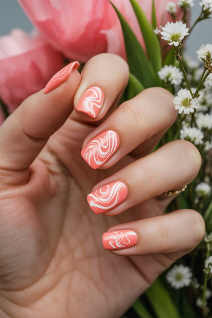 Coral and white swirls create a clean, elegant look for spring nails. The mix of the bright coral with soft white adds contrast without being too bold. This design works well for both casual and formal occasions. It often features delicate, flowing patterns that catch the eye.