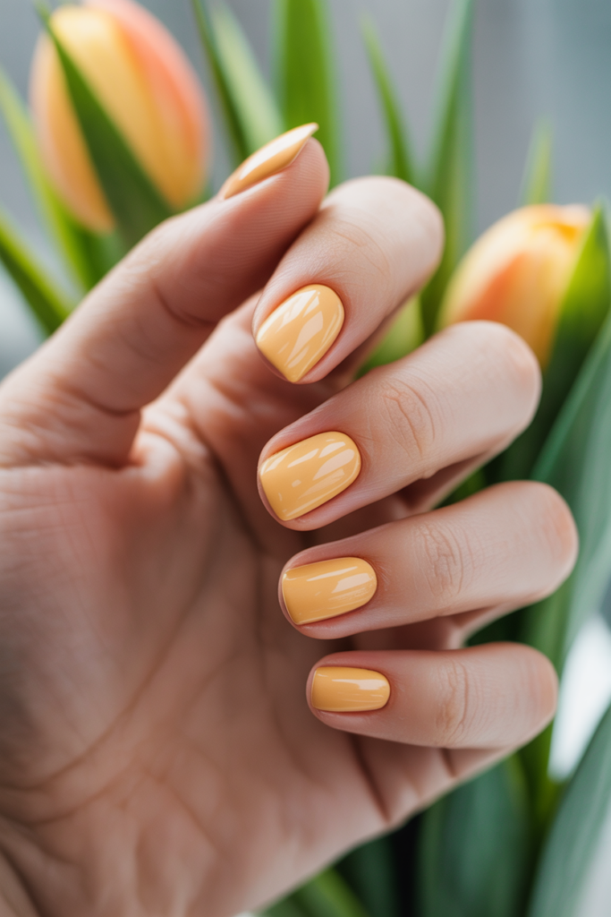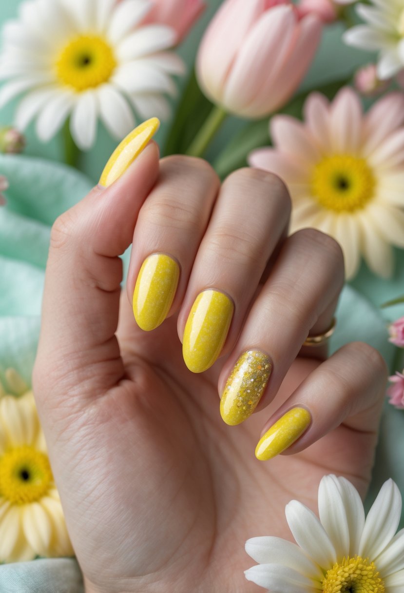 Buttercup yellow nails add a soft, sunny touch that fits spring perfectly. Adding glitter gives a subtle sparkle without overwhelming the look.
